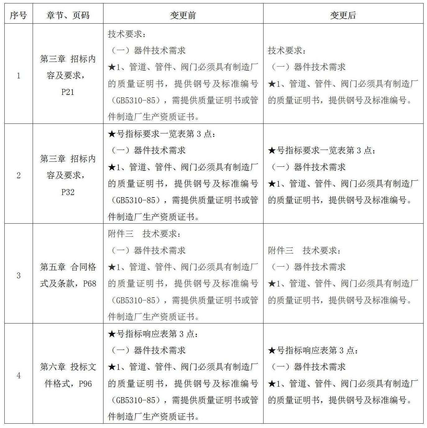 一、现对南宁卷烟厂2023年烘丝机蒸汽管道优化改造(项目编号:GXTZ-ZB-2023第(729)号)发布的招标文件做出如下变更: